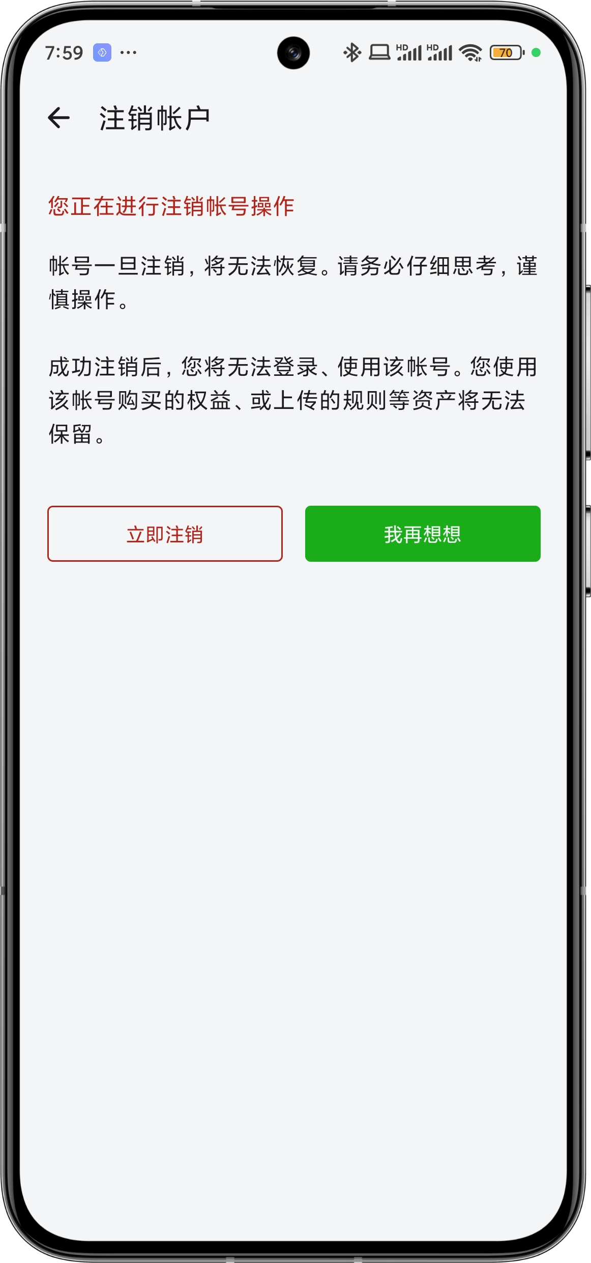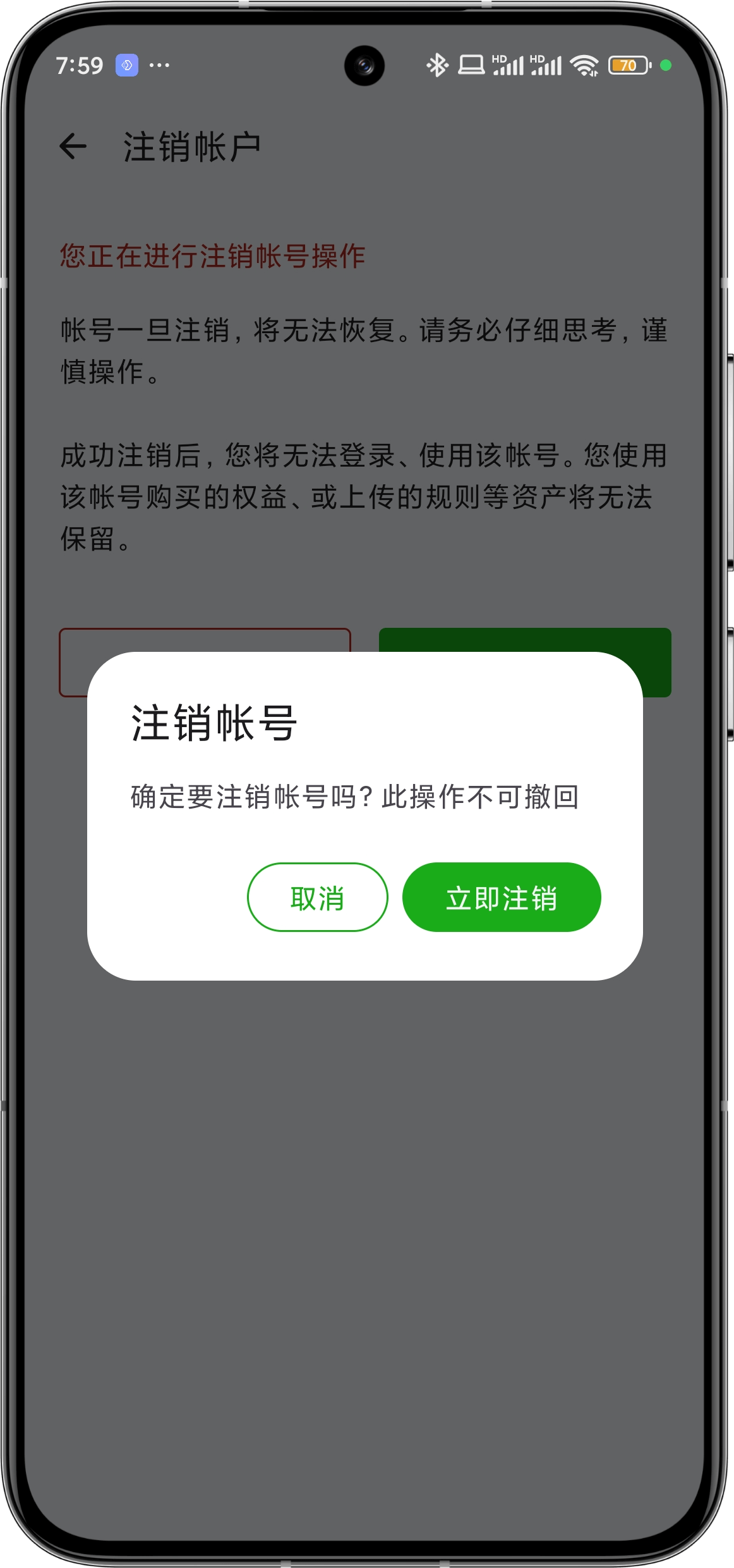 The account cancellation path is Mine > Click on username card > Personal information page > Cancel account > Cancel now. Please note that once an account is cancelled, it cannot be recovered. Please think carefully and proceed with caution. After successful cancellation, you will not be able to log in or use that account. Any benefits purchased with that account or assets such as uploaded rules will not be retained.
