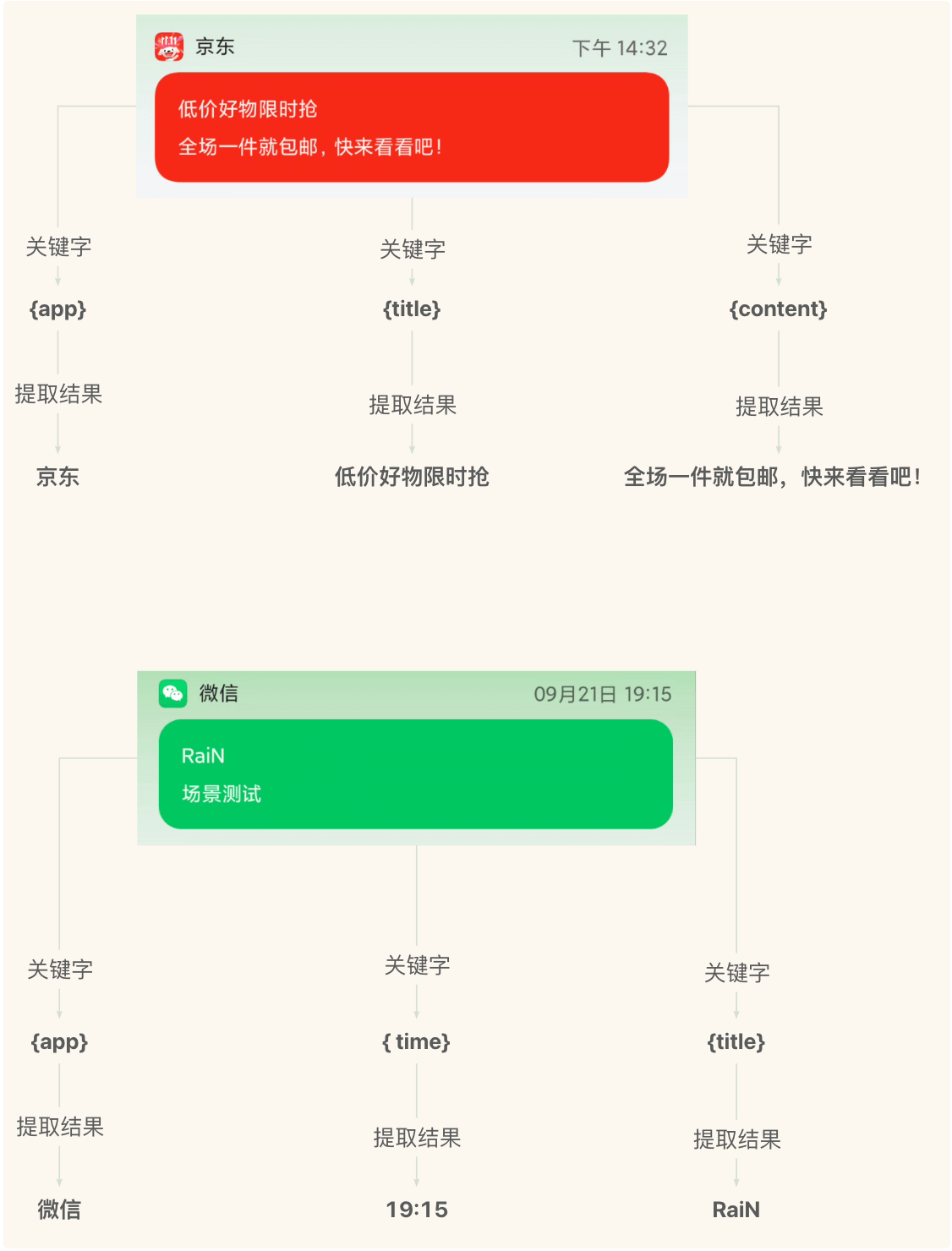 Keywords are special reserved characters built into the App for extracting corresponding text from notifications. Below is the keyword reference table supported by "OneNotify":