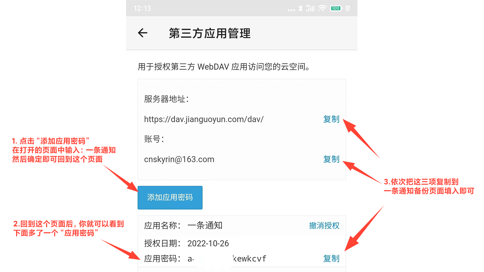 It's recommended to send the WebDAV password to your phone via WeChat or QQ, then copy it to OneNotify, to avoid manual input errors.