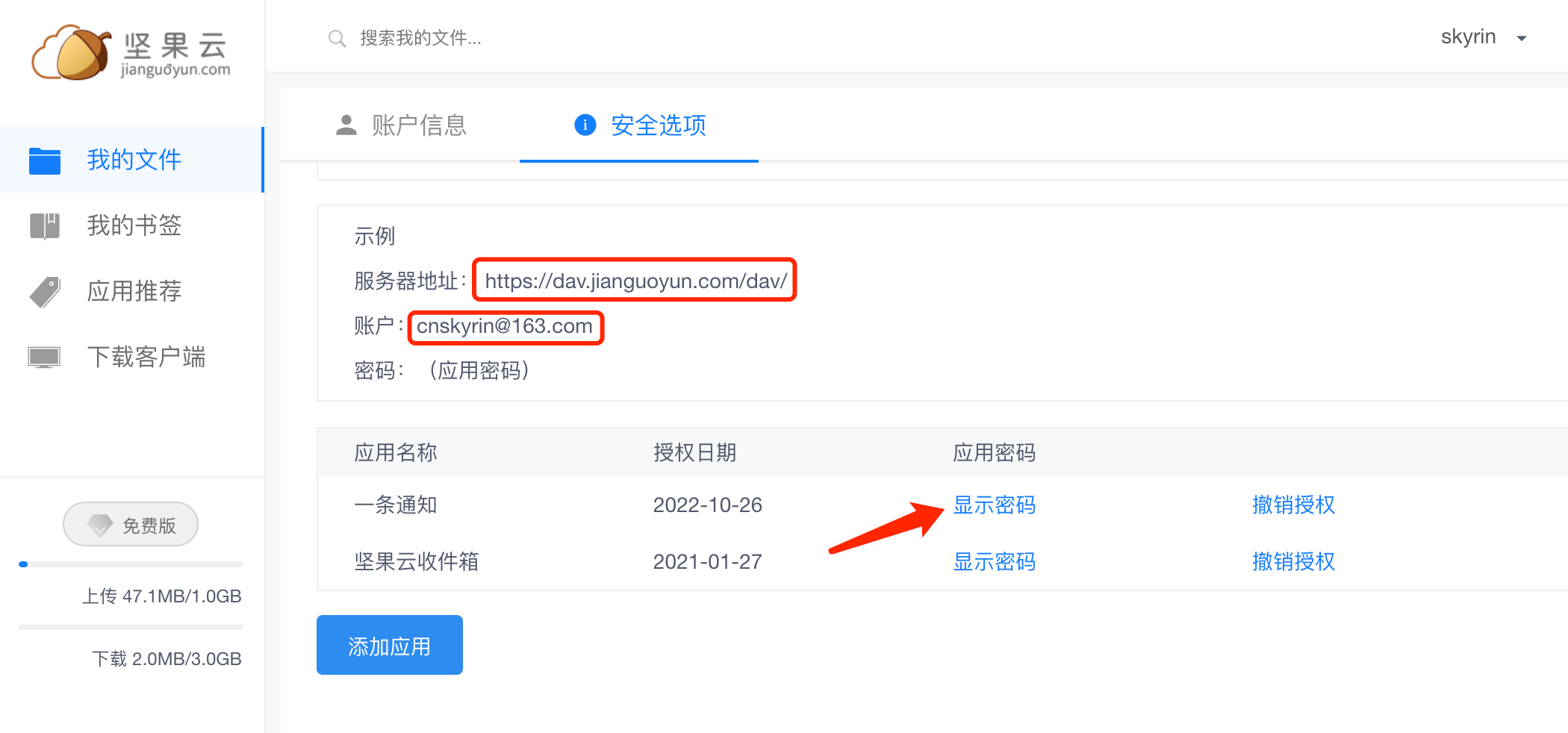 Here, https://dav.jianguoyun.com/dav/ is what you'll enter as the WebDAV URL in OneNotify; the email address after the account is your WebDAV account; and the password shown after clicking display password is your WebDAV password.