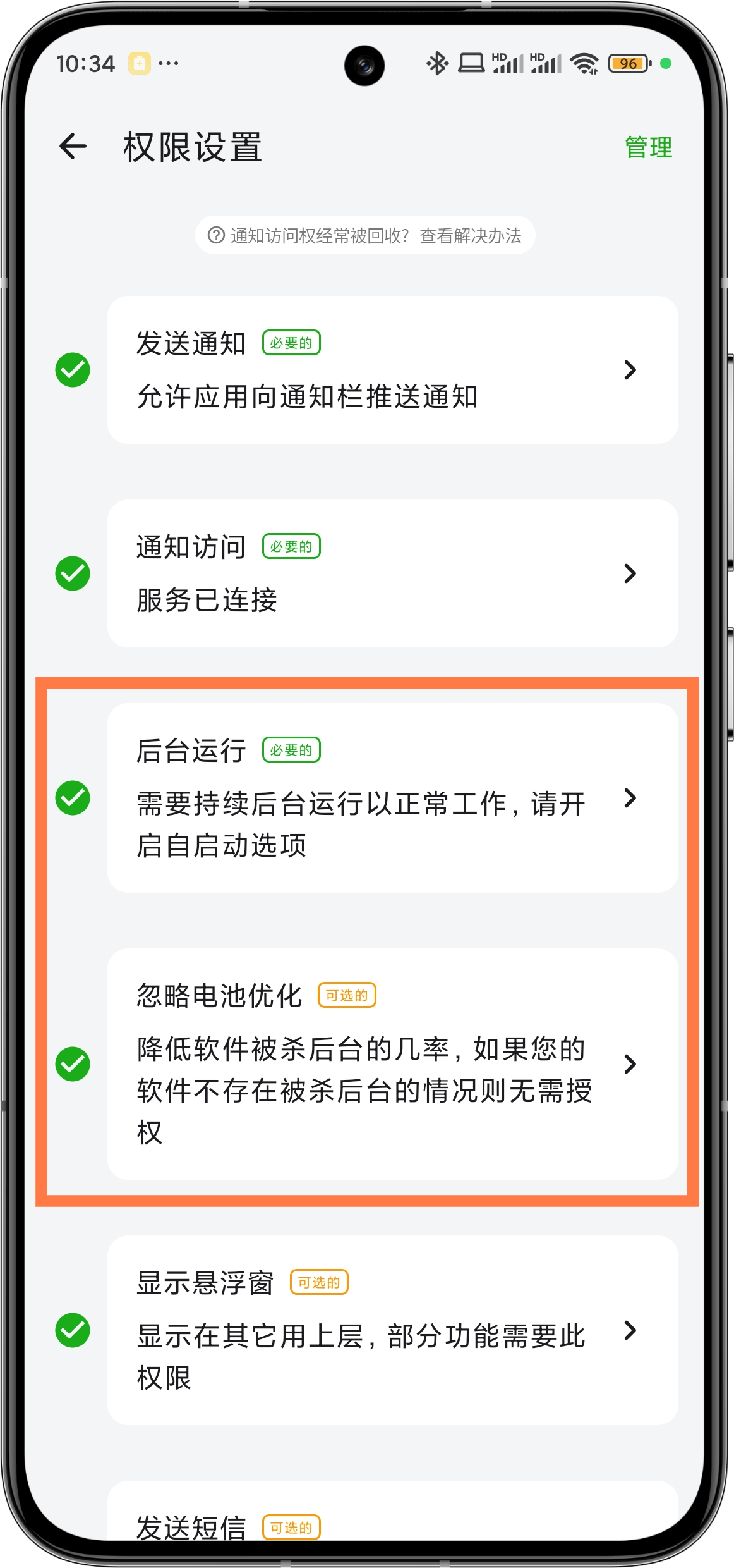| Turn off switch, set to manual management | Set to not allow battery optimization |