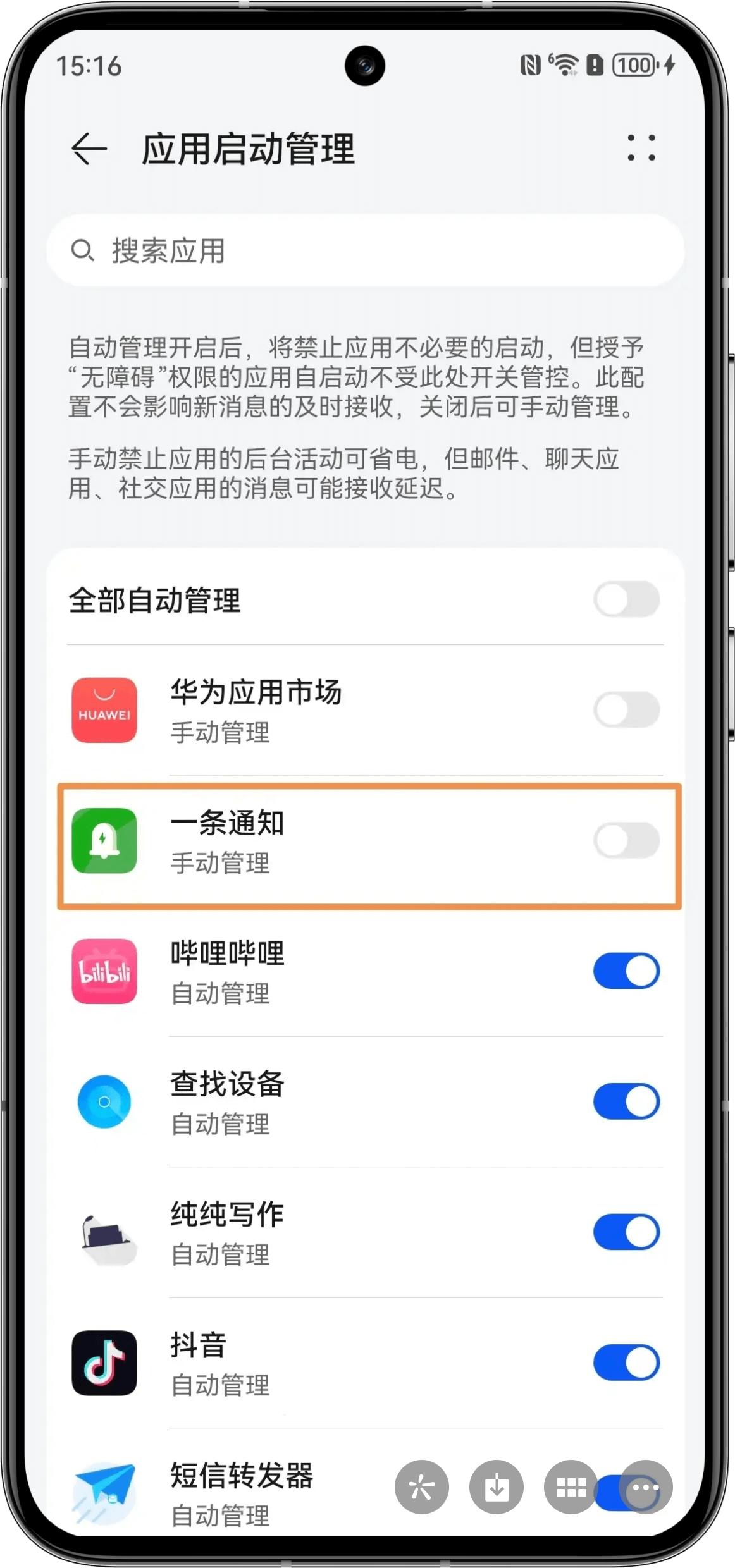 If the notification access permission switch in auto-start management is already on, but the App indicates the permission is not enabled, please follow the App's indication - turn off and then turn on the notification access permission switch again.