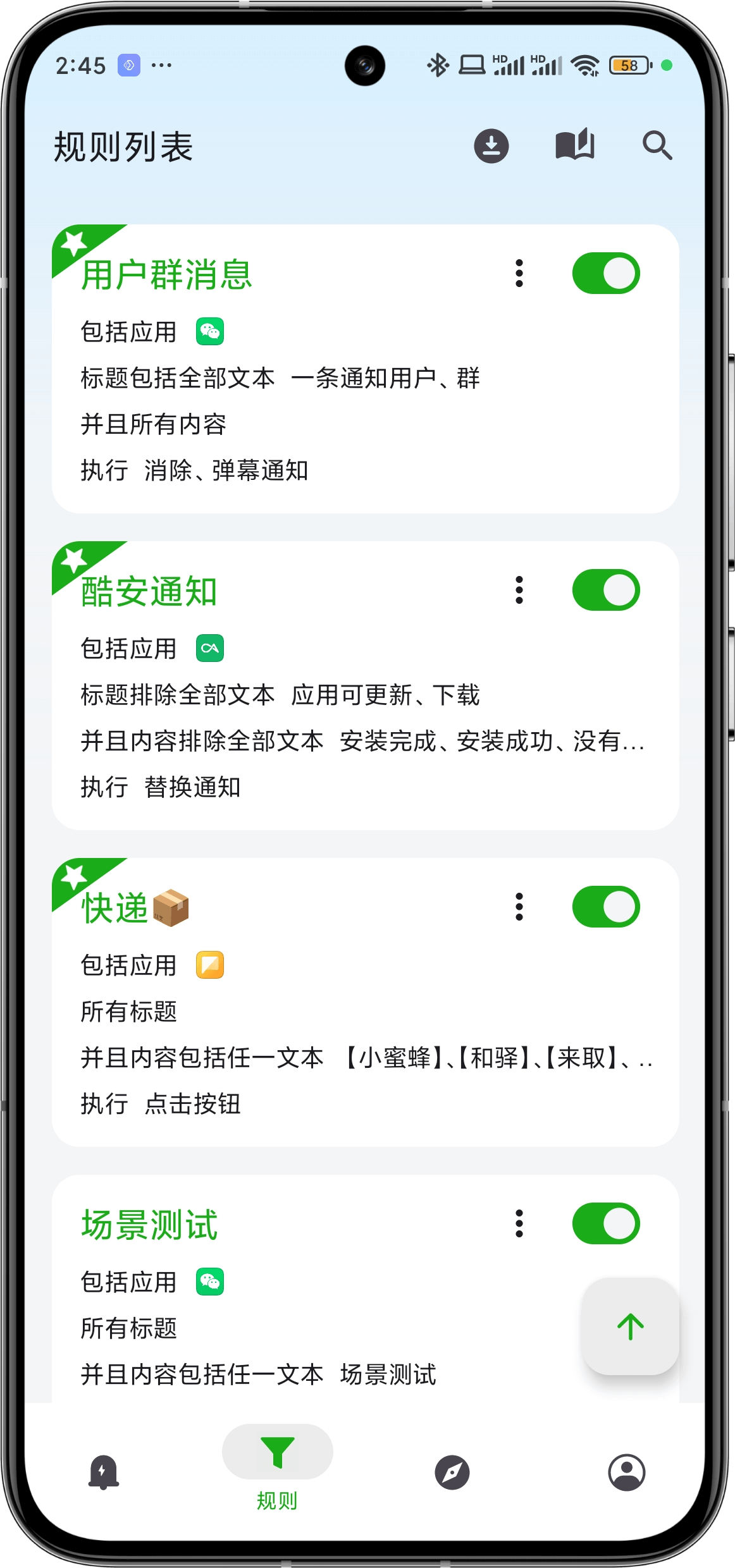 The second tab page is the rule list, which records all your custom notification matching rules. They determine how to match system notifications, what actions to execute, and save the matched notifications and execution records in the Notification List.